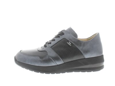 Finn Comfort dames veterschoen, model Drena uit de City lijn, op een sleehak gebaseerde afwikkelzool. Ideaal bij een hallux valgus voettype, vanwege de gebroken leestvorm en breed draagvlak. Verlicht ook de spanning op de achillespees en peesplaat, zodat deze minder tractie krijgt bij het afbuigen van de voet. Zwart met grijs leer. Valt tussen een wijdte G en H, geschikt voor de gemiddelde tot iets bredere voet. Uitneembaar ecologisch en anatomisch gevormde voetbed.