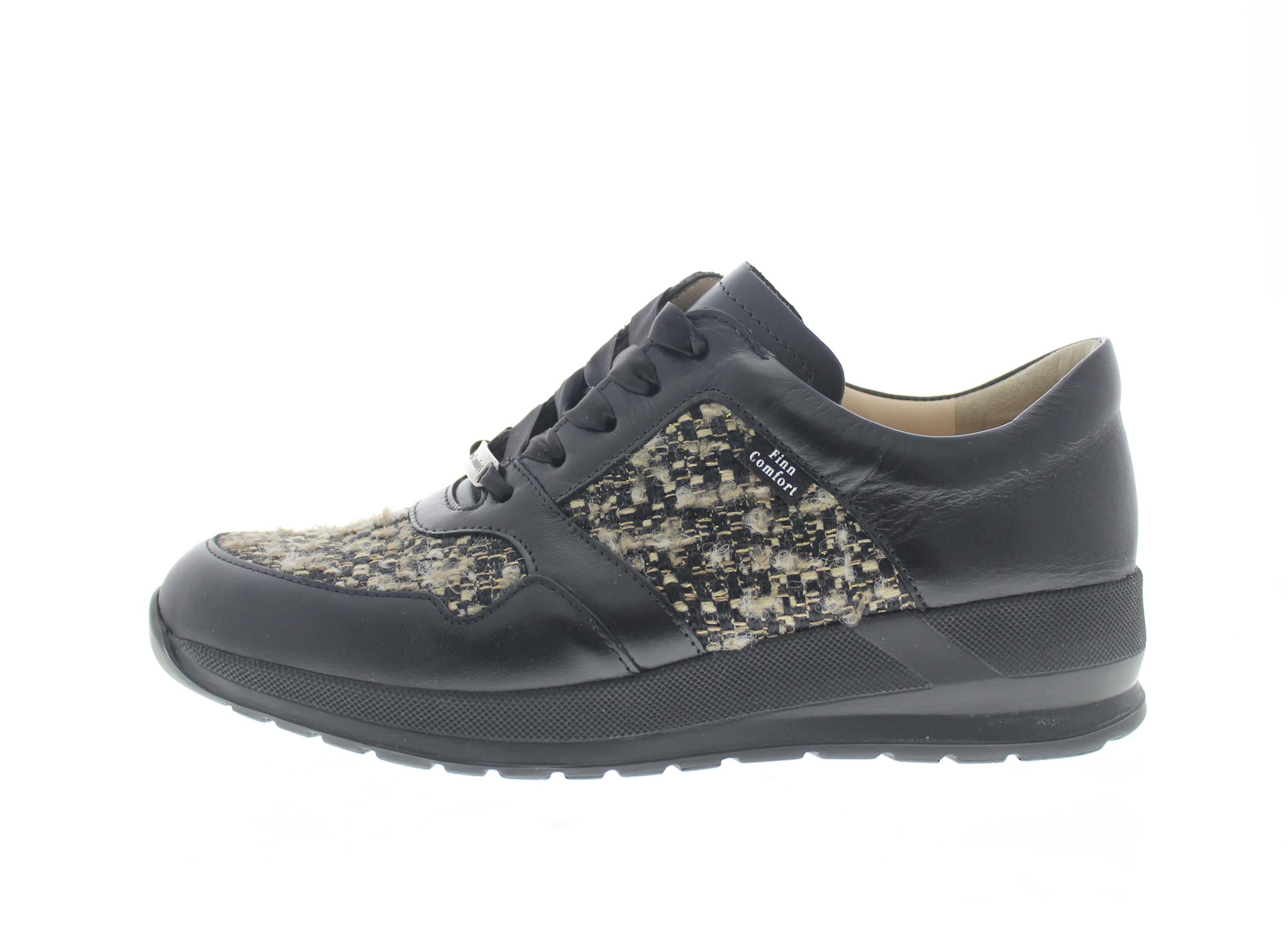 Finn Comfort dames veterschoen, model Drena uit de City lijn, op een sleehak gebaseerde afwikkelzool. Ideaal bij een hallux valgus voettype, vanwege de gebroken leestvorm en breed draagvlak. Verlicht ook de spanning op de achillespees en peesplaat, zodat deze minder tractie krijgt bij het afbuigen van de voet. Zwart leer met textiel. Valt tussen een wijdte G en H, geschikt voor de gemiddelde tot iets bredere voet. Uitneembaar ecologisch en anatomisch gevormde voetbed.