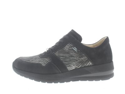 Finn Comfort dames veterschoen, model Drena uit de City lijn, op een sleehak gebaseerde afwikkelzool. Ideaal bij een hallux valgus voettype, vanwege de gebroken leestvorm en breed draagvlak. Verlicht ook de spanning op de achillespees en peesplaat, zodat deze minder tractie krijgt bij het afbuigen van de voet. Zwart nubuck met een fantasieprent. Valt tussen een wijdte G en H, geschikt voor de gemiddelde tot iets bredere voet. Uitneembaar ecologisch en anatomisch gevormde voetbed.