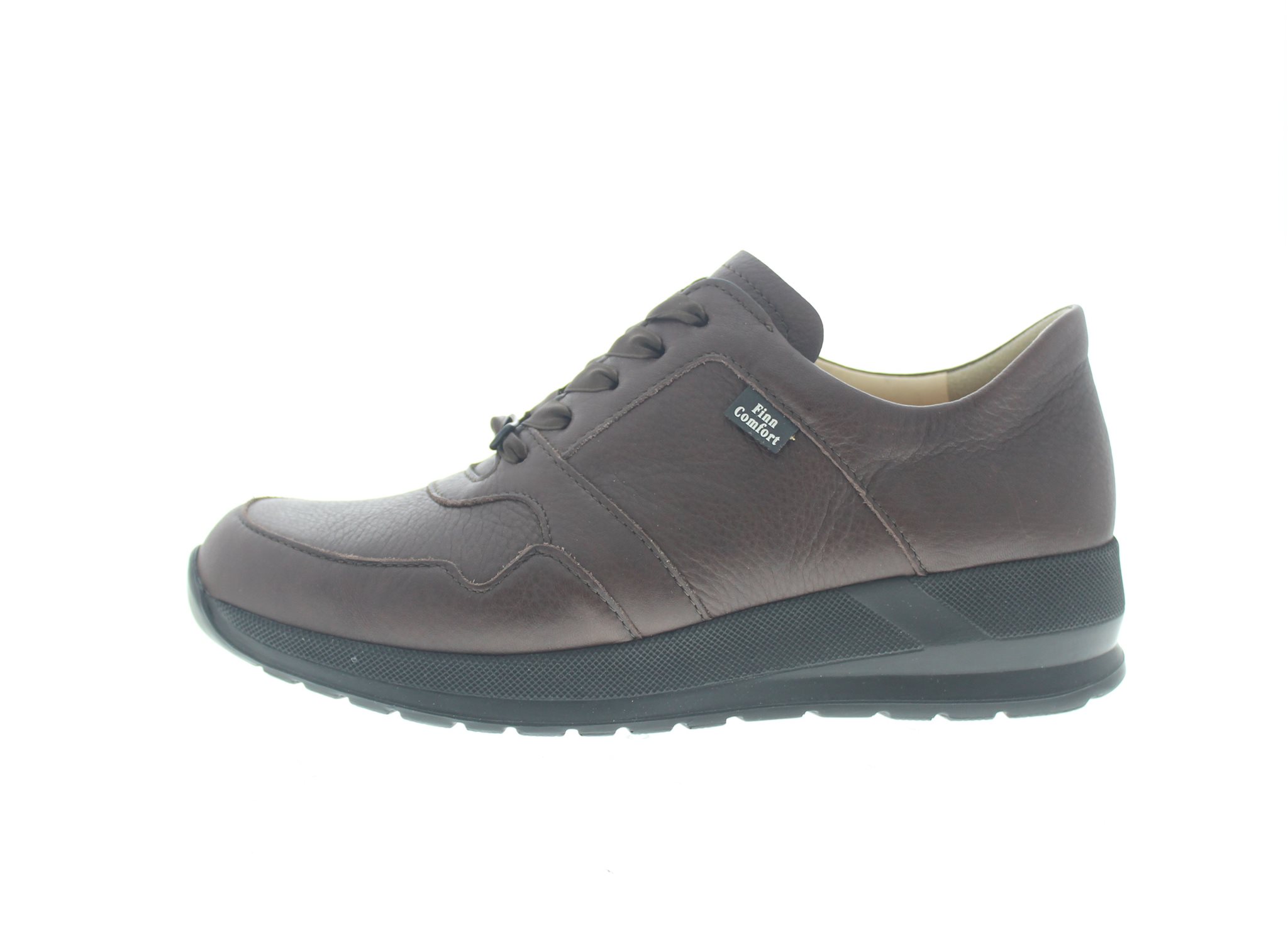 Finn Comfort dames veterschoen, model Drena uit de City lijn, op een sleehak gebaseerde afwikkelzool. Ideaal bij een hallux valgus voettype, vanwege de gebroken leestvorm en breed draagvlak. Verlicht ook de spanning op de achillespees en peesplaat, zodat deze minder tractie krijgt bij het afbuigen van de voet. Bruin leer. Valt tussen een wijdte G en H, geschikt voor de gemiddelde tot iets bredere voet. Uitneembaar ecologisch en anatomisch gevormde voetbed.