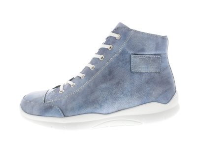 Finn Comfort dames bootie, model Eindhoven uit de Finnamic afwikkel lijn, jeans blauw gevlamd glad leer, valt als een wijdte K, geschikt voor de brede voet, uitneembaar voetbed. Zeer geschikt bij het verlichten en bestrijden van hiel(spoor) en voorvoet klachten (metatarsalgie).