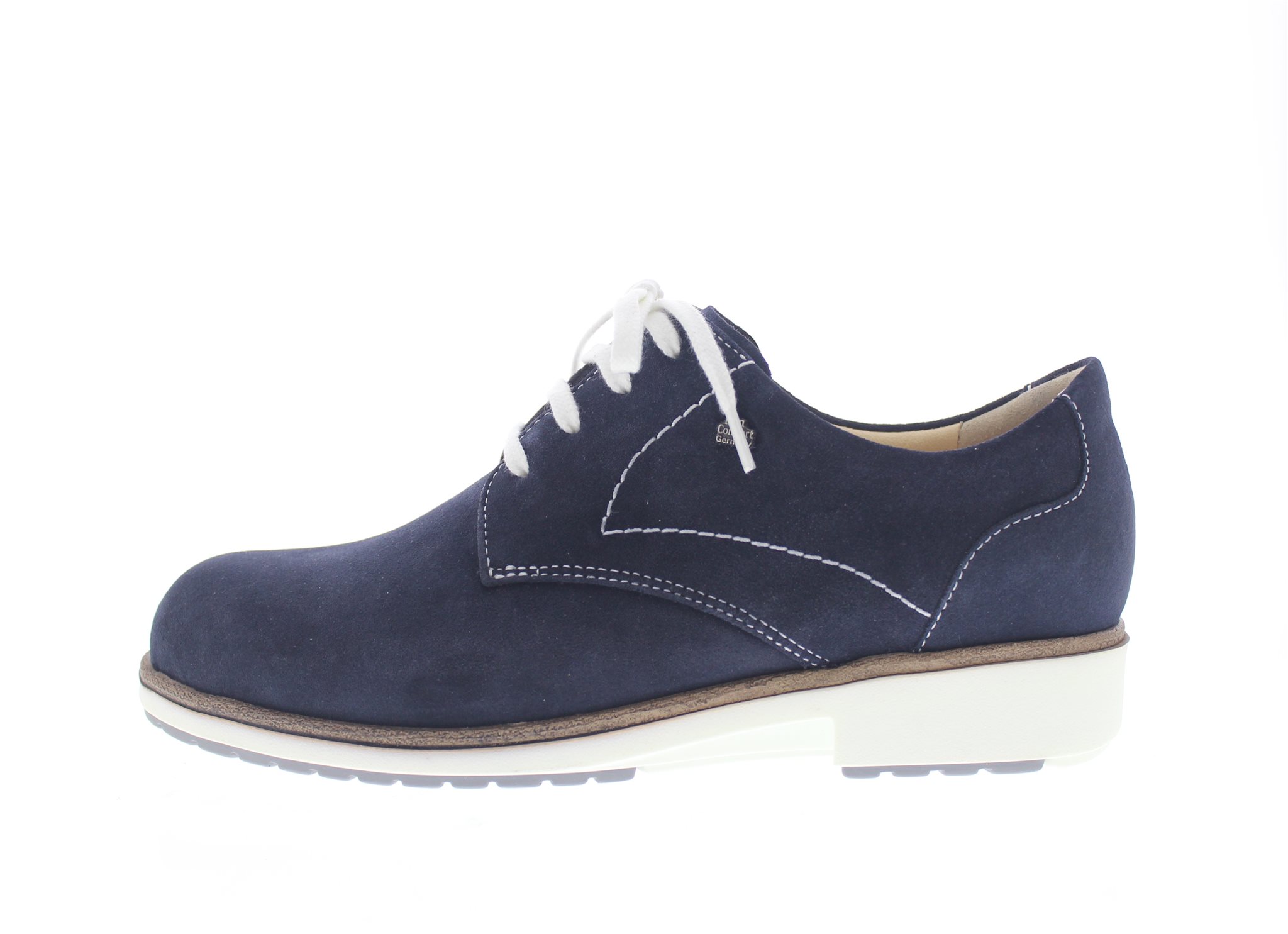 Finn Comfort dames veterschoen, model Elmhurst uit de LadyLine. Stabiele schoen met een soepele afwikkeling en een antislip profiel voor extra grip. Geen voelbare stiknaden rond de balwijdte ten gunste van een een hallux valgus of bunion. Blauw nubuck leer. Valt als een wijdte K, geschikt voor de brede voet. Uitneembaar ecologisch en anatomisch gevormde voetbed.