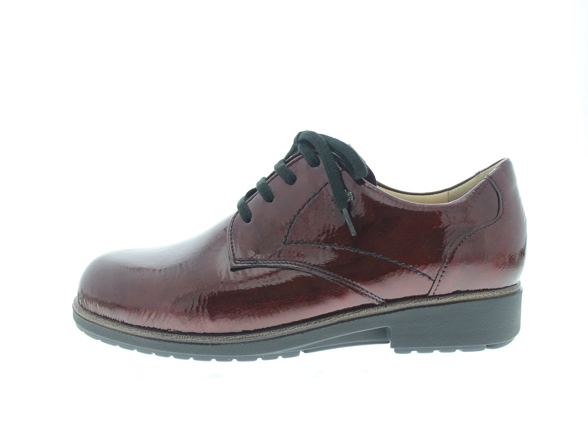 Finn Comfort dames veterschoen, model Elmhurst uit de LadyLine. Stabiele schoen met een soepele afwikkeling en een antislip profiel voor extra grip. Geen voelbare stiknaden rond de balwijdte ten gunste van een een hallux valgus of bunion. Bordo lakleer. Valt als een wijdte K, geschikt voor de brede voet. Uitneembaar ecologisch en anatomisch gevormde voetbed.