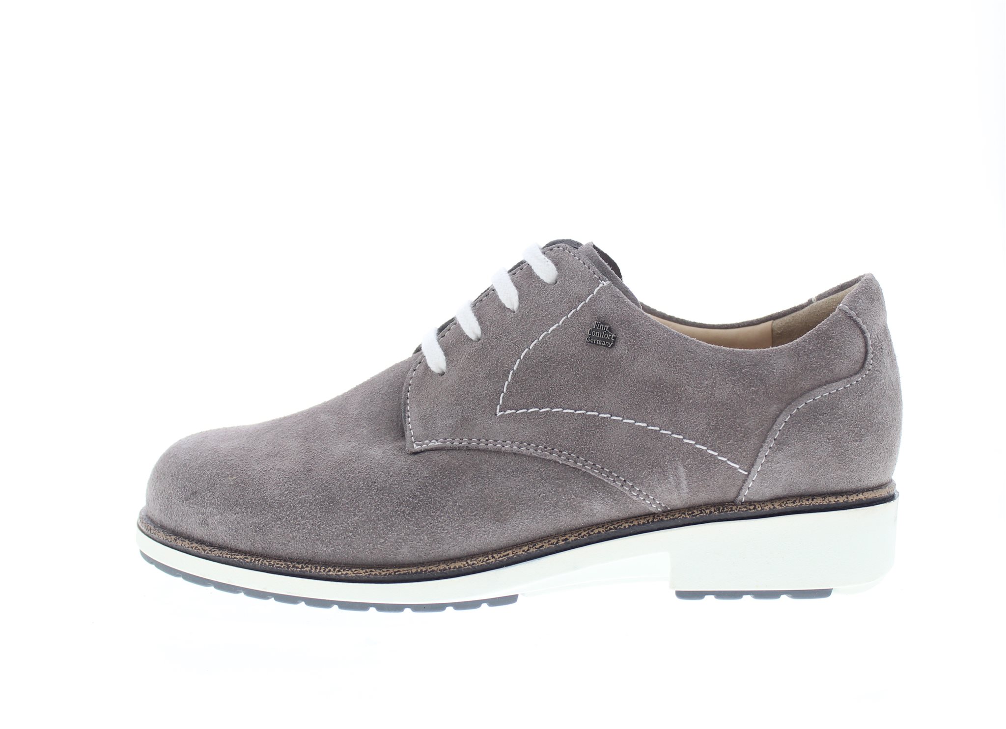 Finn Comfort dames veterschoen, model Elmhurst uit de LadyLine. Stabiele schoen met een soepele afwikkeling en een antislip profiel voor extra grip. Geen voelbare stiknaden rond de balwijdte ten gunste van een een hallux valgus of bunion. Grijs suède. Valt als een wijdte K, geschikt voor de brede voet. Uitneembaar ecologisch en anatomisch gevormde voetbed.