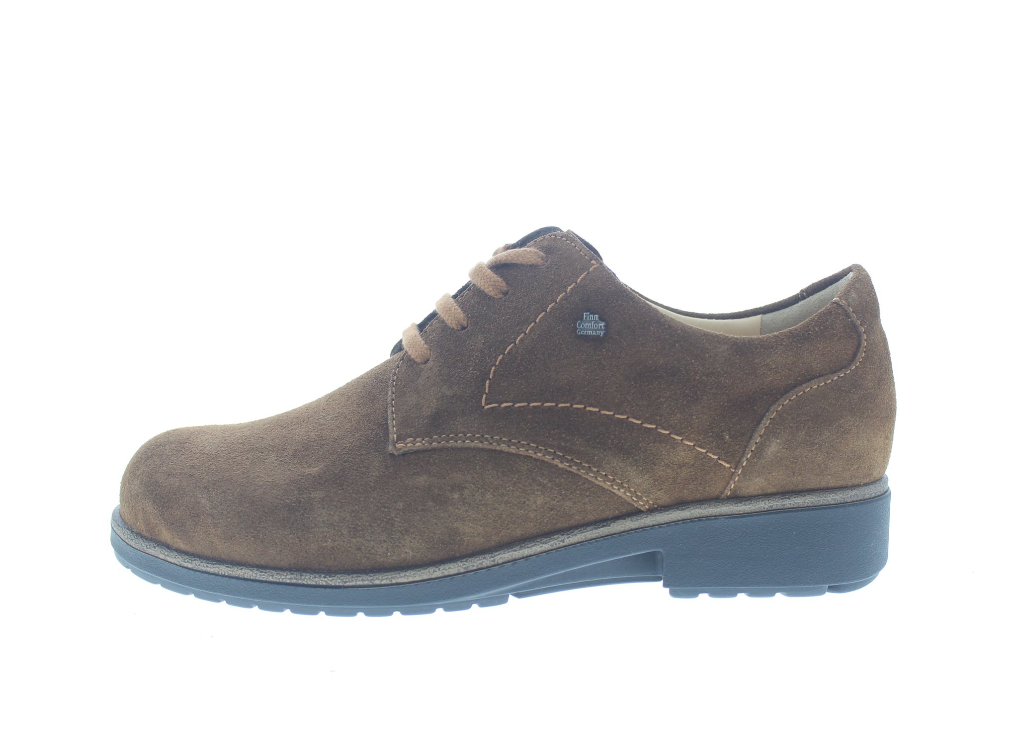 Finn Comfort dames veterschoen, model Elmhurst uit de LadyLine. Stabiele schoen met een soepele afwikkeling en een antislip profiel voor extra grip. Geen voelbare stiknaden rond de balwijdte ten gunste van een een hallux valgus of bunion. Hazelnoot bruin suède. Valt als een wijdte K, geschikt voor de brede voet. Uitneembaar ecologisch en anatomisch gevormde voetbed.