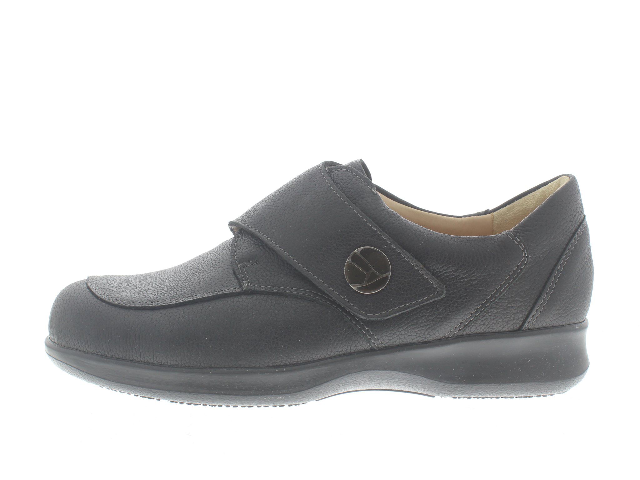 Finn Comfort dames klittenbandschoen, model Empoli uit de CitySport lijn. Met een enkele overslag klittenbandsluiting met een sierknop. Voorzien van een stevige loopzool met teensprong voor het makkelijk afwikkelen van de voet. Zwart glad leer. Valt tussen een wijdte G en J, waarbij een J staat voor een meer toegeknepen hielslot, ten opzichte van een bredere balwijdte. Geschikt voor de normale tot iets bredere voet. Uitneembaar ecologisch en anatomisch gevormde voetbed. Finn Comfort inlegzolen zijn los verkrijgbaar.