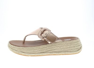 Fitflop dames slipper, model F-Mode Espadrille. De F-Mode zool is stugger en wikkelt makkelijker af dan de klassieke onderwerken. Zeer gunstig bij een gelimiteerde beweging van het grote teengewricht. ‘Wobble Board’ comfort technologische loopzool met een stevig rubberen slijtzool met profiel. Deze onderscheid zich bij het bestrijden van hielspoor en voorvoet gerelateerde klachten door middel van een ongekende demping. Roze goud metallic glad leer met een met gesp verstelbare wreefband. Valt als een wijdte H, geschikt voor de iets bredere voet. Dit model heeft geen uitneembaar voetbed.