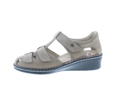 Finn Comfort dames sandaal, model Funen uit de City lijn. Beige nubuck leer, met drie verstelbare klittenbanden en een semi gesloten hiel voor iets meer stabiliteit. Uitneembaar ecologisch en anatomisch gevormde voetbed. Valt als een wijdte H, geschikt voor de normale tot iets bredere voet. De loopzool is gebaseerd op een sleehak waardoor eventuele achillespees klachten worden verlicht.
