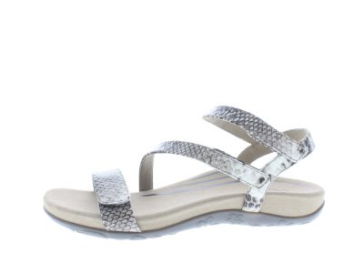 Aetrex dames sandaal, model Gabby Snake. Aetrex sandalen zijn voorzien van een ingebouwde ondersteunende voetbed met een lichte correctie om ook het overproneren tegen te gaan. Hierdoor ervaar je meer steun en stabiliteit. Dit zorgt ervoor dat de enkels niet naar binnen knikken, een rechtere lichaamshouding bevordert, en hiel en voorvoet klachten ontlast middels een stimulerende afwikkeling en dempende eigenschappen. Het zachte materiaal neemt enigszins je eigen voetafdruk aan en is zeer comfortabel bij doorgezakte voeten. Uitgevoerd in glad leer met een slangenprent. Valt tussen een wijdte G en H, geschikt voor de normale voet.