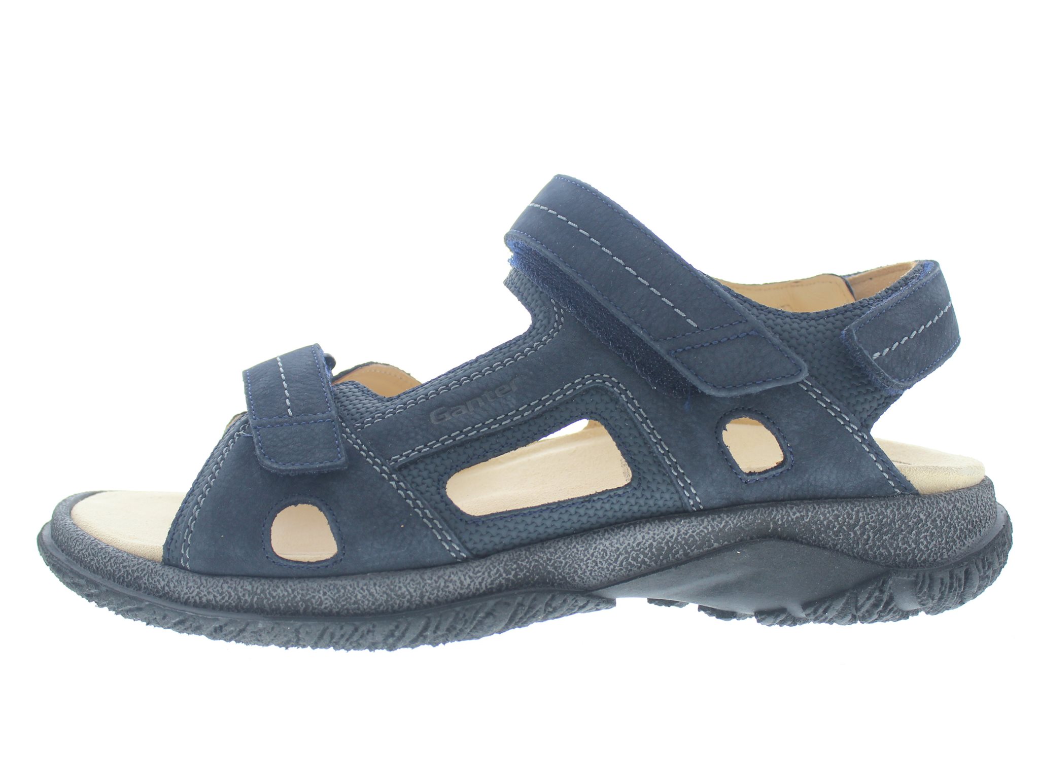 Ganter heren sandaal, model Giovanni uit de Aktiv lijn. Op drie punten verstelbare klittenbandsluitingen en een sportieve loopzool voor veel loopgemak. Donkerblauw nubuck met een chroomarm plantaardig gelooide kalfsleren binnenvoering. Wijdte G, leest geschikt voor de normale tot iets bredere voet. Uitneembaar voetbed met klittenband voorziening.
