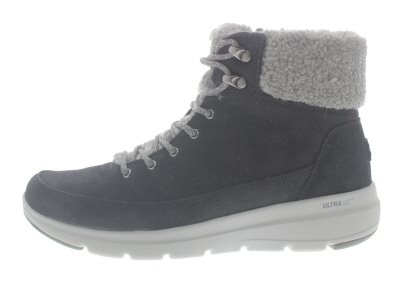 Skechers dames winterbootie, model Glacial Ultra Woodlands. Voorzien van een flexibele loopzool met een Air-Cooled GOGA MAT dempende tussenzool. Pluche gevoerd, inclusief het vaste voetbed met een hoge veerkrachtigheid. Zwart suède leer, met een versiering van imitatiebont. Valt tussen een wijdte H en K, geschikt voor de iets bredere voet.