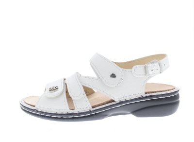 Finn Comfort dames sandaal, model Gomera uit de Classic lijn. Voorzien van drie klittenbandsluitingen en een verstelbare hielband. Wit leer. Valt als een wijdte K, geschikt voor de brede voet. Uitneembaar ecologisch en anatomisch gevormde voetbed.