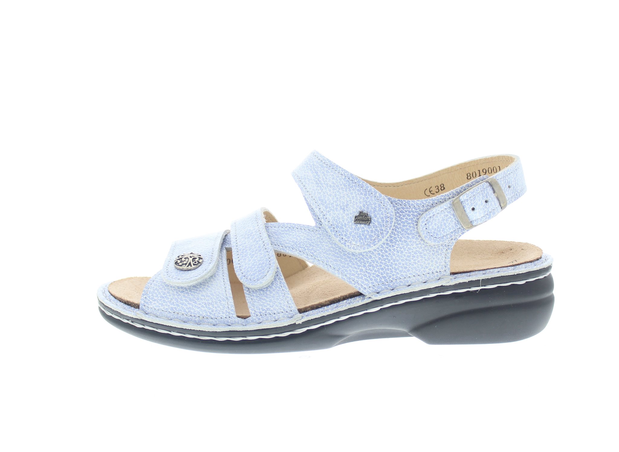 Finn Comfort dames sandaal, model Gomera uit de Classic lijn. Voorzien van drie klittenbandsluitingen en een verstelbare hielband. Blauw reliëf leer. Valt als een wijdte K, geschikt voor de brede voet. Uitneembaar ecologisch en anatomisch gevormde voetbed.