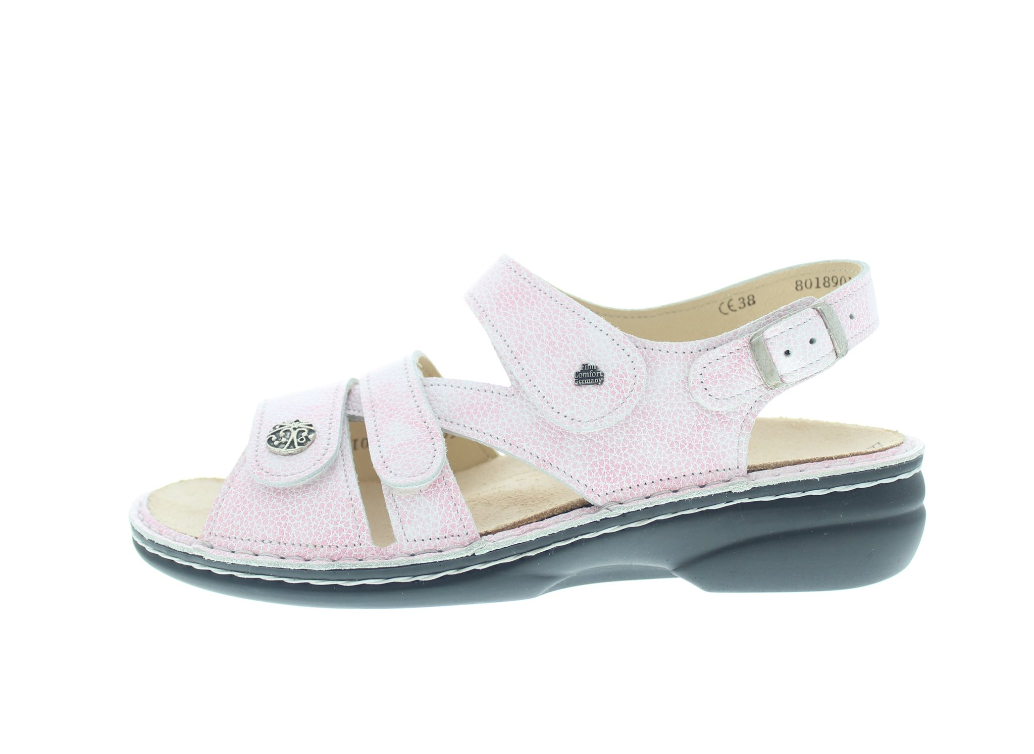 Finn Comfort dames sandaal, model Gomera uit de Classic lijn. Voorzien van drie klittenbandsluitingen en een verstelbare hielband. Roze reliëf leer. Valt als een wijdte K, geschikt voor de brede voet. Uitneembaar ecologisch en anatomisch gevormde voetbed.
