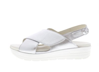 Solidus hippe dames sandaal, model Greta, met een chunky afwikkelzool. Uitgerust met een verstelbare overslag klittenband en een met gesp verstelbare hielband met een drukknop. Dik kurken – anatomisch gevormde – uitneembare voetbed met een zachte deklaag, en een lichte kuipvorm voor iets meer hielstabiliteit. Zilver leer. Wijdte G met iets meer volume, dus ook geschikt voor een wijdte H voet en ideaal bij een hoge wreef. Hakhoogte 38mm. Hielheffing 12mm.