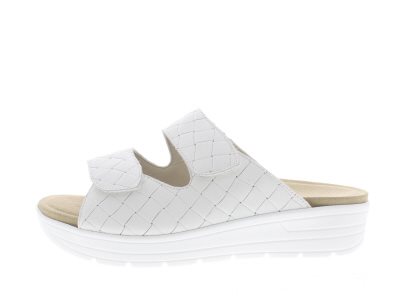 Solidus hippe dames slipper, model Greta, met een chunky afwikkelzool. De zool is stijf genoeg om voorvoetklachten te verlichten .Een verstelbare overslag klittenbandsluiting over de bal van de voet en op de wreef voor een stevige fit, dik kurken, uitneembaar voetbed met een zachte velours deklaag. Wit leer, wijdte G met iets meer volume, dus ook geschikt voor een wijdte H voet en ideaal bij een hoge wreef.