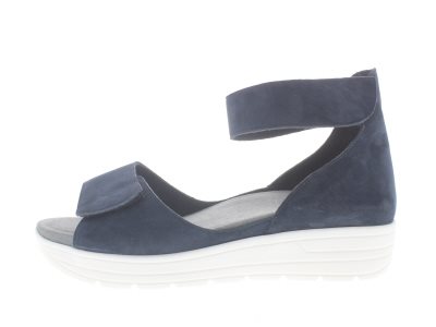 Solidus hippe dames sandaal, model Greta, met een chunky afwikkelzool. De zool is stijf genoeg om voorvoetklachten te verlichten.Een verstelbare overslag klittenbandsluiting en een dichte hiel met enkelband voor de juiste fit, dik kurken, uitneembaar voetbed met een zachte velours deklaag. Blauw suède leer, wijdte G met iets meer volume, dus ook geschikt voor een wijdte H voet en ideaal bij een hoge wreef.