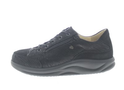 Finn Comfort dames veterschoen, model Hachiouji uit de Finnamic afwikkel lijn. Schoenen uit deze lijn zijn zeer geschikt bij het ontlasten en verlichten van hiel en voorvoet gerelateerde klachten, en zorgt tevens voor een rechtere rug houding en ondersteuning bij rugklachten. Zwart nubuck. Rits voor het instapgemak en een gepolsterde tong voor extra comfort op de wreef. Valt als een wijdte H, geschikt voor de bredere voet. Uitneembaar ecologisch en anatomisch gevormde voetbed.
