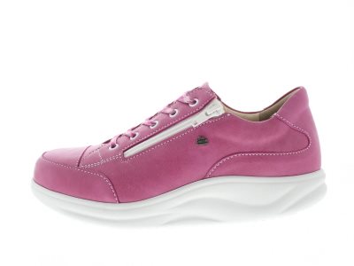 Finn Comfort dames veterschoen, model Hachiouji uit de Finnamic afwikkel lijn. Schoenen uit deze lijn zijn zeer geschikt bij het ontlasten en verlichten van hiel en voorvoet gerelateerde klachten, en zorgt tevens voor een rechtere rug houding en ondersteuning bij rugklachten. Roze leer. Rits voor het instapgemak en een gepolsterde tong voor extra comfort op de wreef. Valt als een wijdte H, geschikt voor de bredere voet. Uitneembaar ecologisch en anatomisch gevormde voetbed.