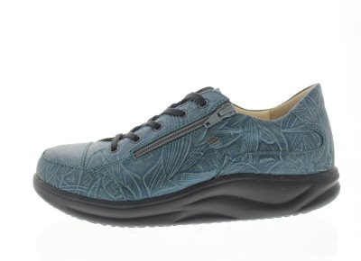 Finn Comfort dames veterschoen, model Hachiouji uit de Finnamic afwikkel lijn. Schoenen uit deze lijn zijn zeer geschikt bij het ontlasten en verlichten van hiel en voorvoet gerelateerde klachten, en zorgt tevens voor een rechtere rug houding en ondersteuning bij rugklachten. petrol glad leer met glimmende details, rits voor het instapgemak en een gepolsterde tong voor extra comfort op de wreef. Valt tussen een wijdte H en K, geschikt voor de bredere voet. Uitneembaar ecologisch en anatomisch gevormde voetbed. Hakhoogte 32mm. Hielheffing 12mm. Impregneren met Collonil Carbon Pro