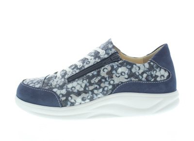 Finn Comfort dames veterschoen, model Hachiouji uit de Finnamic afwikkel lijn. Schoenen uit deze lijn zijn zeer geschikt bij het ontlasten en verlichten van hiel en voorvoet gerelateerde klachten, en zorgt tevens voor een rechtere rug houding en ondersteuning bij rugklachten. Blauw nubuck met een met zilver gemêleerde honingraat patroon. Rits voor het instapgemak en een gepolsterde tong voor extra comfort op de wreef. Valt als een wijdte H, geschikt voor de bredere voet. Uitneembaar ecologisch en anatomisch gevormde voetbed.