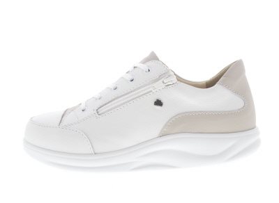 Finn Comfort dames veterschoen, model Hachiouji uit de Finnamic afwikkel lijn. Schoenen uit deze lijn zijn zeer geschikt bij het ontlasten en verlichten van hiel en voorvoet gerelateerde klachten, en zorgt tevens voor een rechtere rug houding en ondersteuning bij rugklachten. Wit leer met beige kleurige hiel. Rits voor het instapgemak en een gepolsterde tong voor extra comfort op de wreef. Valt als een wijdte H, geschikt voor de bredere voet. Uitneembaar ecologisch en anatomisch gevormde voetbed.