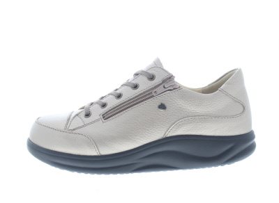 Finn Comfort dames veterschoen, model Hachiouji uit de Finnamic afwikkel lijn. Schoenen uit deze lijn zijn zeer geschikt bij het ontlasten en verlichten van hiel en voorvoet gerelateerde klachten, en zorgt tevens voor een rechtere rug houding en ondersteuning bij rugklachten. Creme/steengrijs metallic leer. Rits voor het instapgemak en een gepolsterde tong voor extra comfort op de wreef. Valt als een wijdte H, geschikt voor de bredere voet. Uitneembaar ecologisch en anatomisch gevormde voetbed.