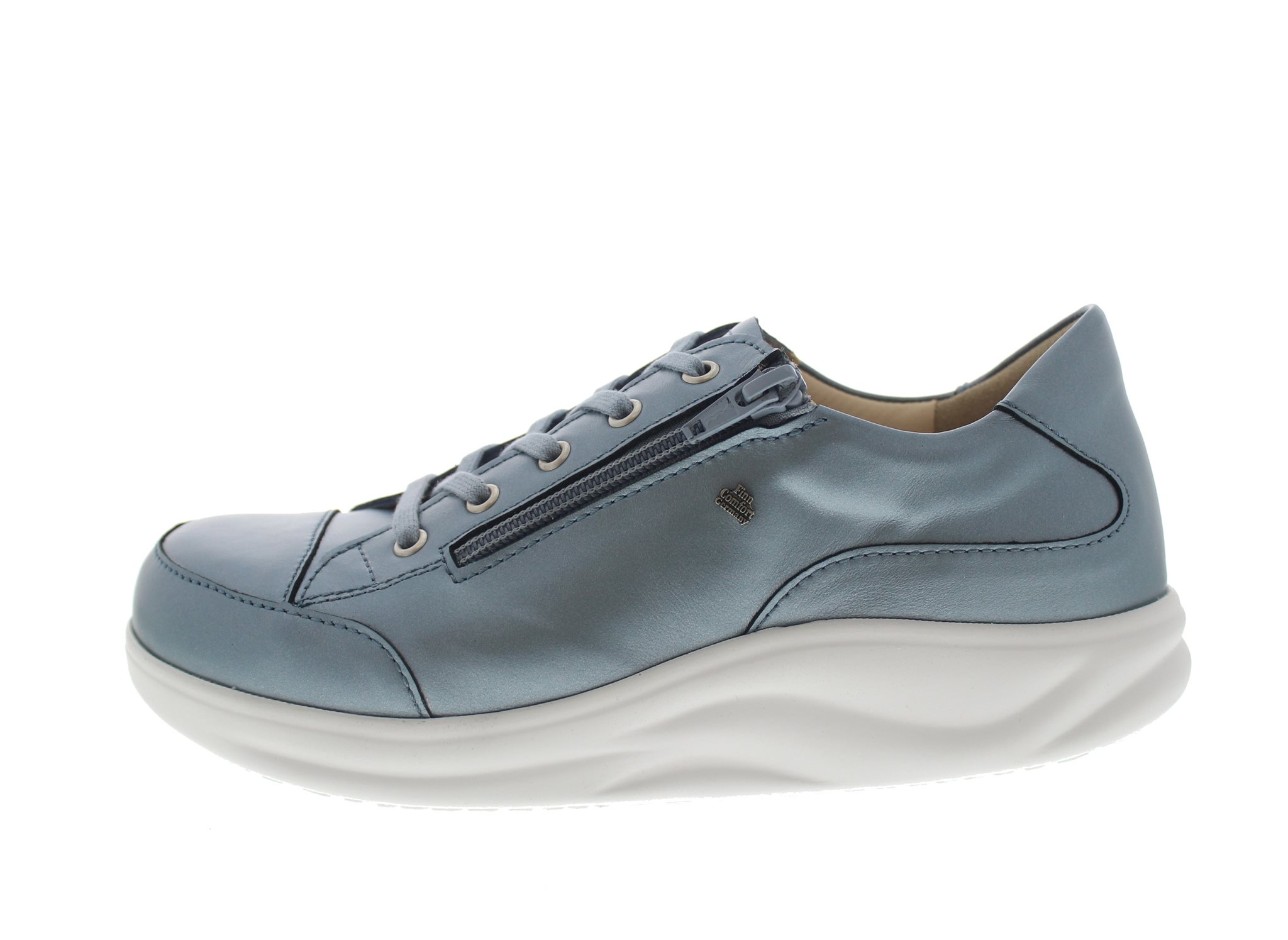 Finn Comfort dames veterschoen, model Hachiouji uit de Finnamic afwikkel lijn. Schoenen uit deze lijn zijn zeer geschikt bij het ontlasten en verlichten van hiel en voorvoet gerelateerde klachten, en zorgt tevens voor een rechtere rug houding en ondersteuning bij rugklachten. Blauw metallic leer. Rits voor het instapgemak en een gepolsterde tong voor extra comfort op de wreef. Valt als een wijdte H, geschikt voor de bredere voet. Uitneembaar ecologisch en anatomisch gevormde voetbed. Hakhoogte 32mm. Hielheffing 12mm. Impregneren met Collonil Carbon Pro