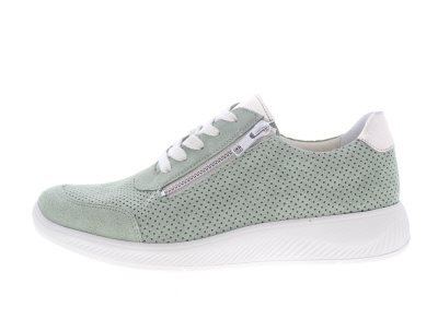 Solidus dames sneaker, model Halea H. Voorzien van een flexibele loopzool met een licht afrollend effect en een groot draagvlak. De verlengde contrefort zorgt voor een goede hielstabiliteit. Dit samen zorgt voor een soepele looppatroon met een rechte afwikkeling waar je niet bij na hoeft te denken en volop kan genieten van stads- en wandel omgeving. En natuurlijk is de Halea uitgerust met de Solidus 3D dempende zool technologie voor extra schokabsorptie. Groen geperforeerd suède. Wijdte H, geschikt voor de iets bredere voet. Uitneembaar anatomisch gevormde voetbed. Hakhoogte 35mm. Hielheffing 20mm.