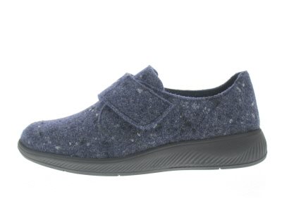 Solidus dames pantoffel, model Halea. Voorzien van een flexibele loopzool met een licht afrollend effect en een groot draagvlak. Blauw wolvilt. Wijdte H, geschikt voor de iets bredere voet. Uitneembaar anatomisch gevormde voetbed. Hakhoogte 35mm. Hielheffing 20mm
