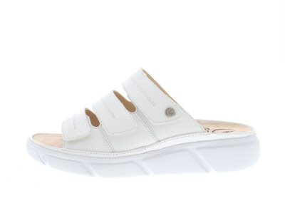 Ganter dames slipper, model Halina. Gemaakt van lichtgewicht materiaal, en volledig verstelbaar naar de gewenste pasvorm vanwege drie klittenbandsluitingen. De zool is aan de stuggere kant en voorzien van een teensprong, waarmee peesplaat gerelateerde klachten worden verlicht of verholpen. Wit lakleer. Wijdte H, geschikt voor de iets bredere voet. Uitneembaar anatomisch gevormde voetbed met zachte toplaag voor extra comfort.