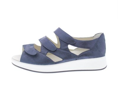 Solidus dames sandaal, model Hannah. Verstelbaar met drie klittenbandsluitingen. Verlengd contrefort met semi dichte flanken voor meer stabiliteit. De doorlopende zool geeft een stevige middenvoet ondersteuning, en zorgt voor een soepele afwikkeling. Blauw metallic nubuck. Wijdte H, geschikt voor de iets bredere voet. Uitneembaar anatomisch gevormde voetbed.