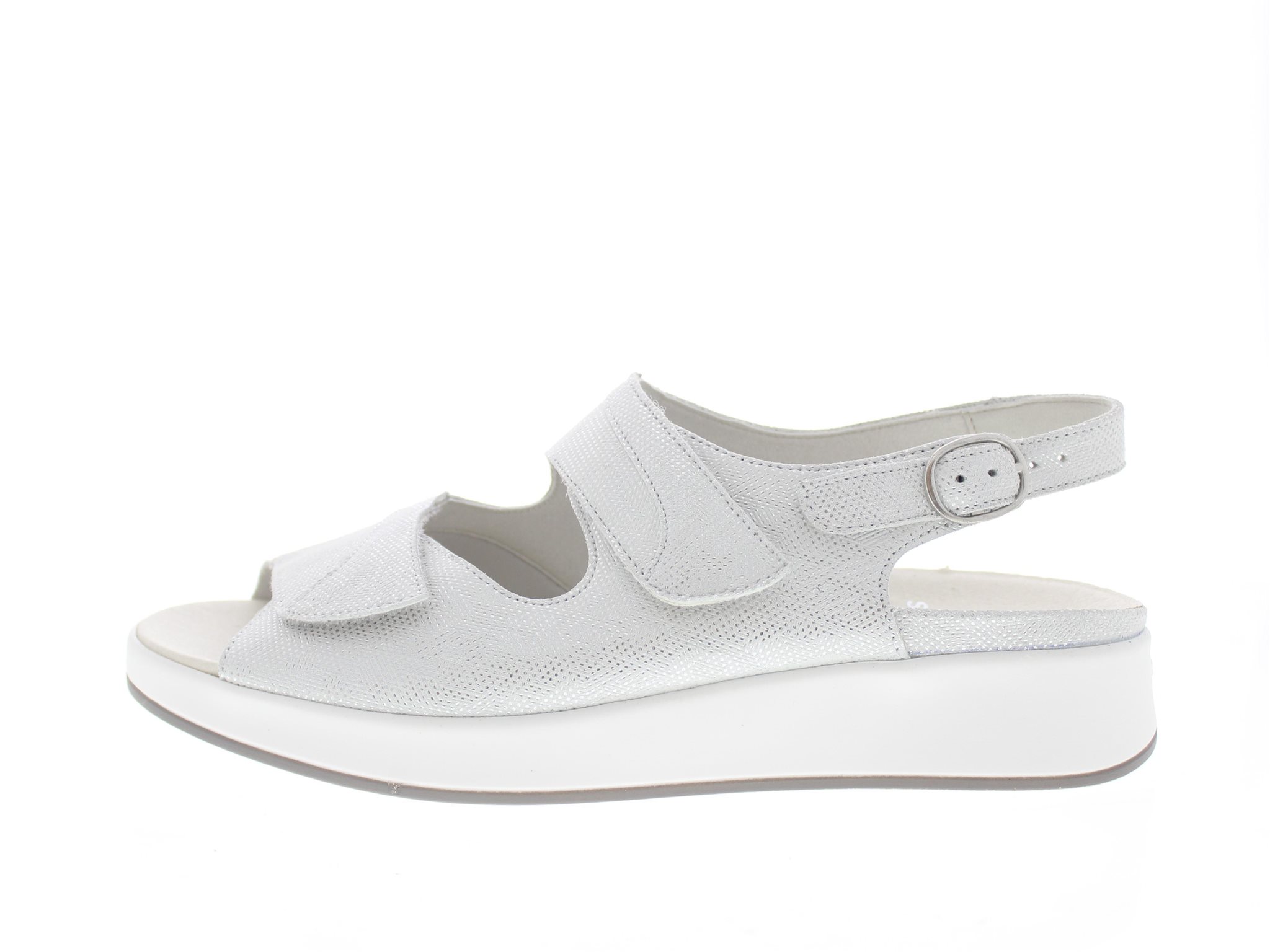 Solidus dames sandaal, model Hannah. Voorzien van twee klittenbansluitingen en een met gesp en drukknop verstelbare hielband. De doorlopende zool geeft een stevige middenvoet ondersteuning, terwijl je geniet van een anatomisch gevormde voetbed, dat tevens met klittenband vast zit en uitneembaar is voor een eigen steunzool. Zilver suède. Wijdte H, geschikt voor de iets bredere voet. Hakhoogte 35mm. Hielheffing 15mm.
