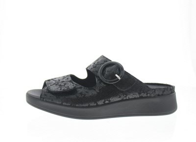 Solidus dames slipper, model Hannah. Dubbele klittenband verstelbare sluitingen met een siergesp. Dichte flanken voor meer support. De doorlopende zool geeft een stevige middenvoet ondersteuning, terwijl je geniet van een anatomisch gevormde voetbed, dat tevens met klittenband vast zit en uitneembaar is voor een eigen steunzool. Zwart gemêleerd leer. Wijdte H, geschikt voor de iets bredere voet. Hakhoogte 35mm. Hielheffing 15mm.