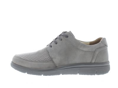 Solidus veterschoen voor heren, model Hardy, een speciale leest die in zowel een breedte H of K wordt gemaakt. Normale loopzool voor een voet met weinig tot geen afwikkelklachten. Grijs gevlamd leer met een geperforeerd voorblad. Wijdte H, geschikt voor de iets bredere voet. Verwisselbaar voetbed voor eigen steunzolen. Hakhoogte 30mm. Hielheffing 16mm.