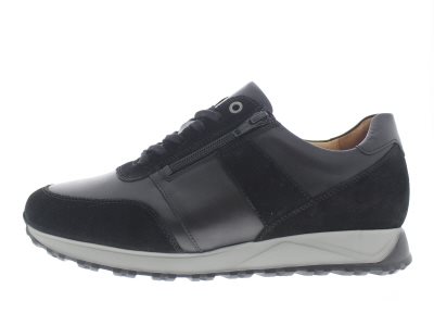 Solidus heren sneaker, model Harry in een volle H wijdte. Geschikt voor de bredere volle voet, vrij hoge teenbox. Zwart glad leer met suède details en een rits voor het instapgemak. Stevig, maar uiterst lichtgewicht -EXTRALIGHT- afwikkelzool, waarbij de zool bij de hiel een trapeziumvorm heeft voor meer stabiliteit. De binnenvoering is ultiem zacht en aangenaam met vrijwel geen voelbare stiknaden, waardoor deze diabetisch te verantwoorden is voor diegenen die over het algemeen geen wonden lopen. Uitneembaar voetbed.