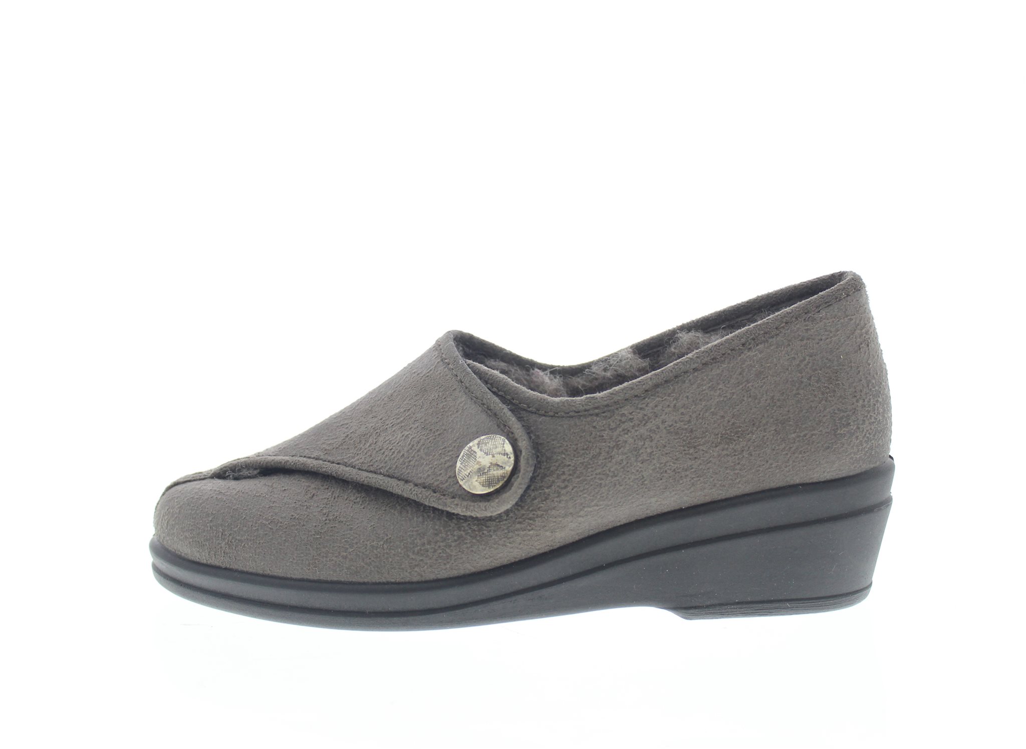Rhode dames pantoffel, model Hausschuh. Wol gevoerd, met een klittenbandsluiting. Buitenvoering is van textiel met een suède look. Wijdte H, geschikt voor de normale voet. Dit model heeft een vast voetbed.
