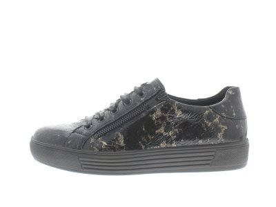 Veterschoen van het merk Solidus uitgevoerd in zwart lakleer met een leuke print. Deze schoen heeft ook een rits aan de zijkant. Het voetbed is uitneembaar en deze schoen is gemaakt op een wijdte H. Hakhoogte is 30mm en de hieldrop is 16mm.