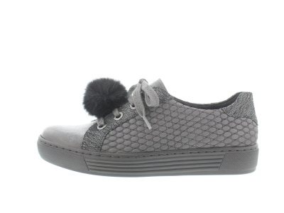 Solidus dames veterschoen met pompom versiering, model Hazel, wijdte H voor de normale tot brede voet, combi grijs nubuck- en gladleer, uitneembaar voetbed, hakhoogte 22 mm.