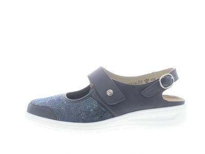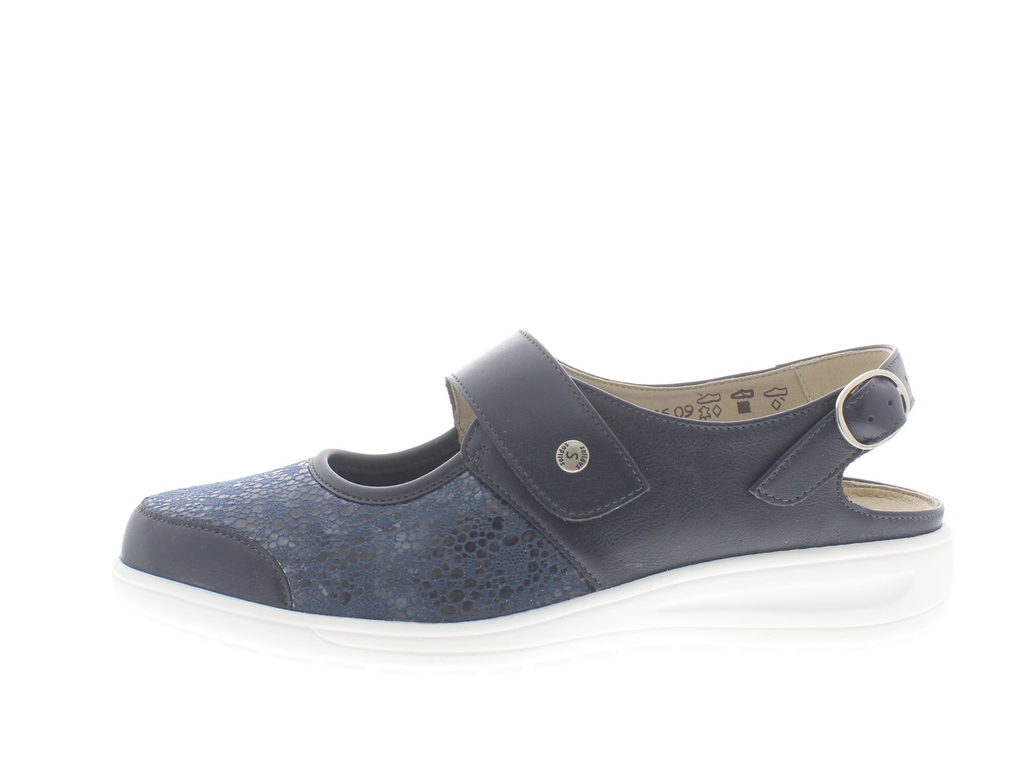 Solidus dames profylaxe bandschoen/muil met een verstelbare hielband, model Heaven uit de Solicare Soft lijn die geschikt zijn bij diabetische en reumatische klachten vanwege de stretch eigenschappen en geen voelbare stiknaden aan de binnenkant van de schoen, licht van gewicht en voorzien van een soepele afwikkelzool met een fijn profiel, wijdte H, geschikt voor de normale tot iets bredere voet, blauw glad leer met een neopreen/scuba voorblad dat zich aanpast aan bunions en vervormde teenknobbels, uitneembaar voetbed.
