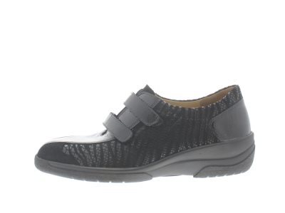 Solidus dames klittenbandschoen, model Hedda, wijdte F, geschikt voor de smalle voet. Zwart nubuck met lak gecombineerd leer, uitneembaar voetbed.