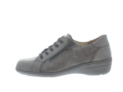 Solidus dames veterschoen. Model Hedda in grijs glad leer gecombineerd met bedrukt leer. Wijdte F. Geschikt voor de slanke voet met uitneembare voetbedden.