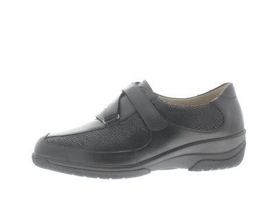 Solidus Hedda dames klittenbandschoen met een z-sluiting door twee passanten voor extra fixatie in een profylaxe uitvoering, speciaal voor de (over)gevoelige voet, zwart glad leer met geprint nubuck, wijdte K, geschikt voor de brede voet maar valt iets compacter als de gemiddelde wijdte K schoenen, uitneembaar voetbed.