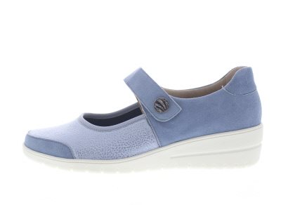 Solidus profylaxe dames bandschoen op een sleehak, model Helia. Blauw nubuck gecombineerd met stretchmateriaal van neopreen/scuba om drukpunten te verlichten, geschikt voor diabetische en reumatische voetklachten, hamertenen en bunions. Super comfortabel vanwege de 3D demping van buitenzool, tussenlaag en dempende elementen van het uitneembare voetbed. Wijdte H, geschikt voor de normale tot iets bredere voet. Hakhoogte 42mm. Hielheffing 32mm.