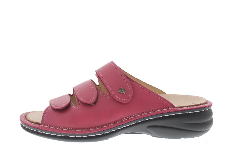 Finn Comfort dames slipper, model Hellas uit de Classic lijn. Voorzien van drie verstelbare klittenbandensluitingen op de voet met dichte flanken voor extra support. Roze leer. Valt als een wijdte H en K, geschikt voor de iets bredere tot brede voet. Uitneembaar ecologisch en anatomisch gevormde voetbed.