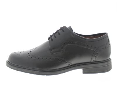 Solidus klassieke herenschoen met een semi-brogue look, model Henk. Licht van gewicht vanwege de PU loopzool met een stevig contrefort en een stabiele hak. Zwart glad leer. Wijdte K, geschikt voor de brede voet. Uitneembaar anatomisch gevormde voetbed.