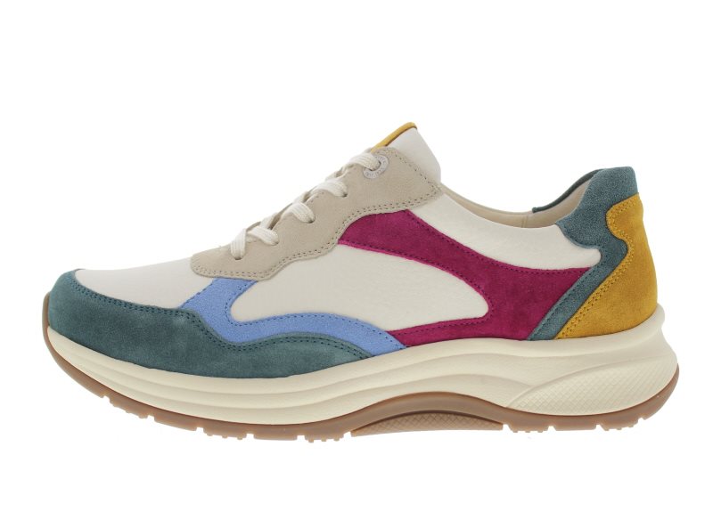Ganter dames veterschoen, model High Flyer. Lichtgewicht vanwege de EXTRALIGHT afrollende loopzool, vervaardigd van schokabsorberende EVA. Dit zorgt ook voor een aangename demping met behoud van stabiliteit. Wit leer met multi kleuren suède. Wijdte H, geschikt voor de iets bredere voet of normale voet dat om meer comfort vraagt. Uitneembaar voetbed.