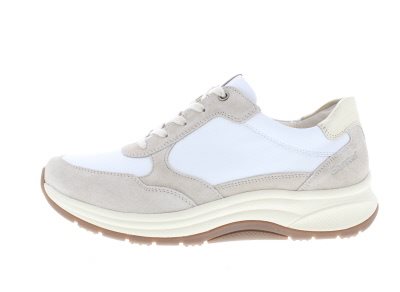 Ganter dames veterschoen, model High Flyer. Lichtgewicht vanwege de EXTRALIGHT afrollende loopzool, vervaardigd van schokabsorberende EVA. Deze zorgt ook voor een aangename demping met behoud van stabiliteit. Wit leer met beige suède. Wijdte H, geschikt voor de iets bredere voet of normale voet dat om meer comfort vraagt. Uitneembaar voetbed.