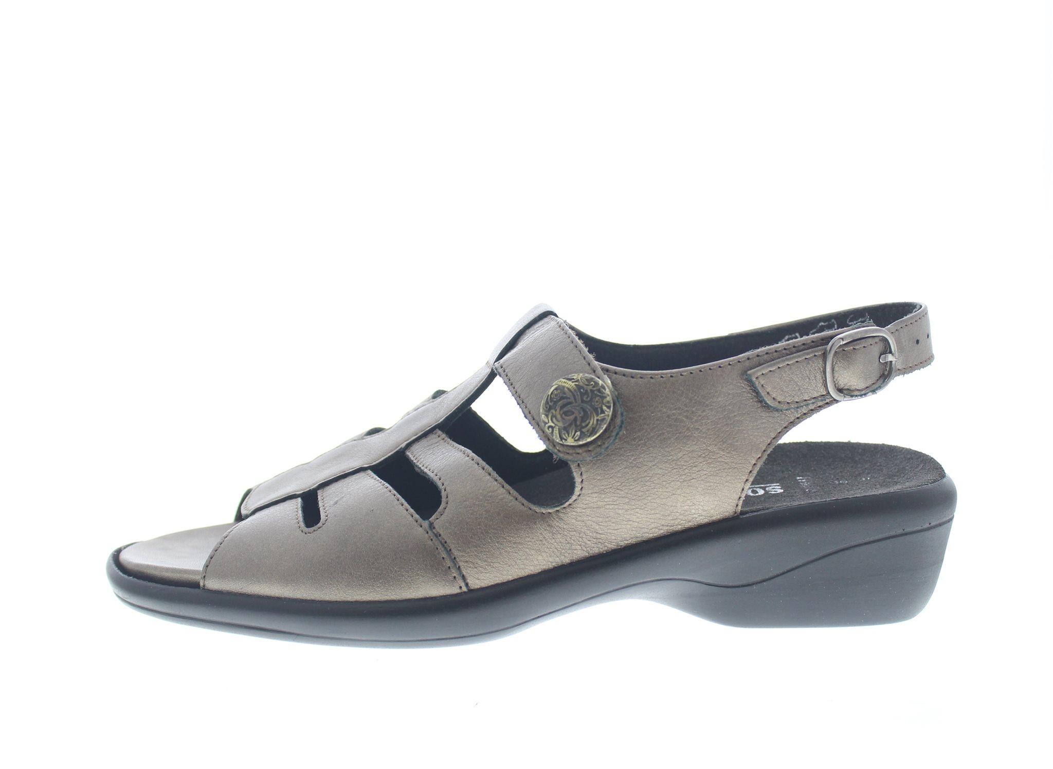 Solidus dames sandaal, model Hilde. Klassiek design met een soepele afwikkelzool. Verstelbare klittenbandsluiting op de wreef en een met gesp en drukknop verstelbare hielband. Brons leer. Wijdte H, geschikt voor de iets bredere voet. Uitneembaar voetbed.