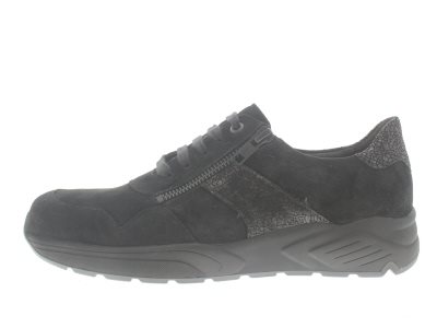 Solidus moderne dames sneaker met een ‘chunky’ afwikkelzool en een rits voor het instapgemak, model Hills. Zwart suède rijgmolière met krakelee leren details. Wijdte F, speciale smalle leest geschikt voor de smallere voet, uitneembaar voetbed.